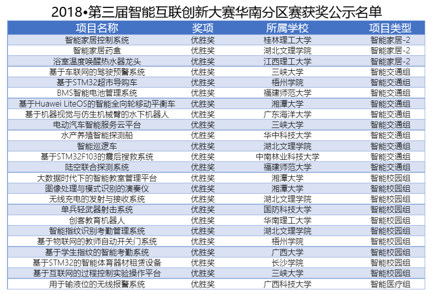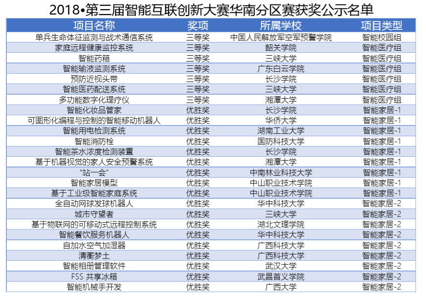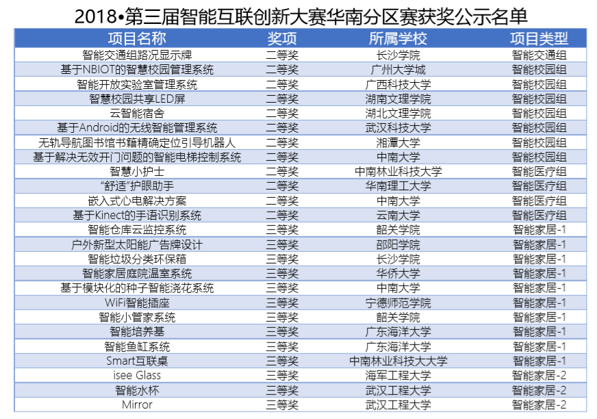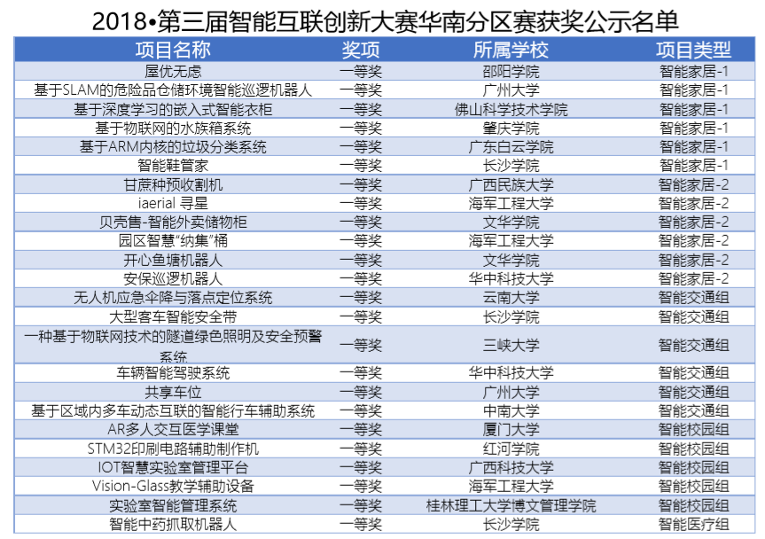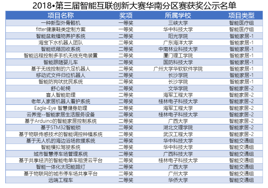 陶梓、彭玮、张轶)7月7-8日,2018年全国智能互联创新大赛华南分区赛在校举行。来自华南赛区的华中科技大学、武汉大学、厦门大学、中南大学、国防科技大学、中山大学、海军工程大学、桂林电子科技大学、云南大学等55所高校的154支参赛队伍对自己通过非凡想象力和实践力设计制造的创新产品进行了现场答辩和作品展示,同时分享和交流创新经验和心得。经过激烈竞争,我校斩获一等奖3项、二等奖2项、优胜奖1项,获得一等奖项数并列第一。