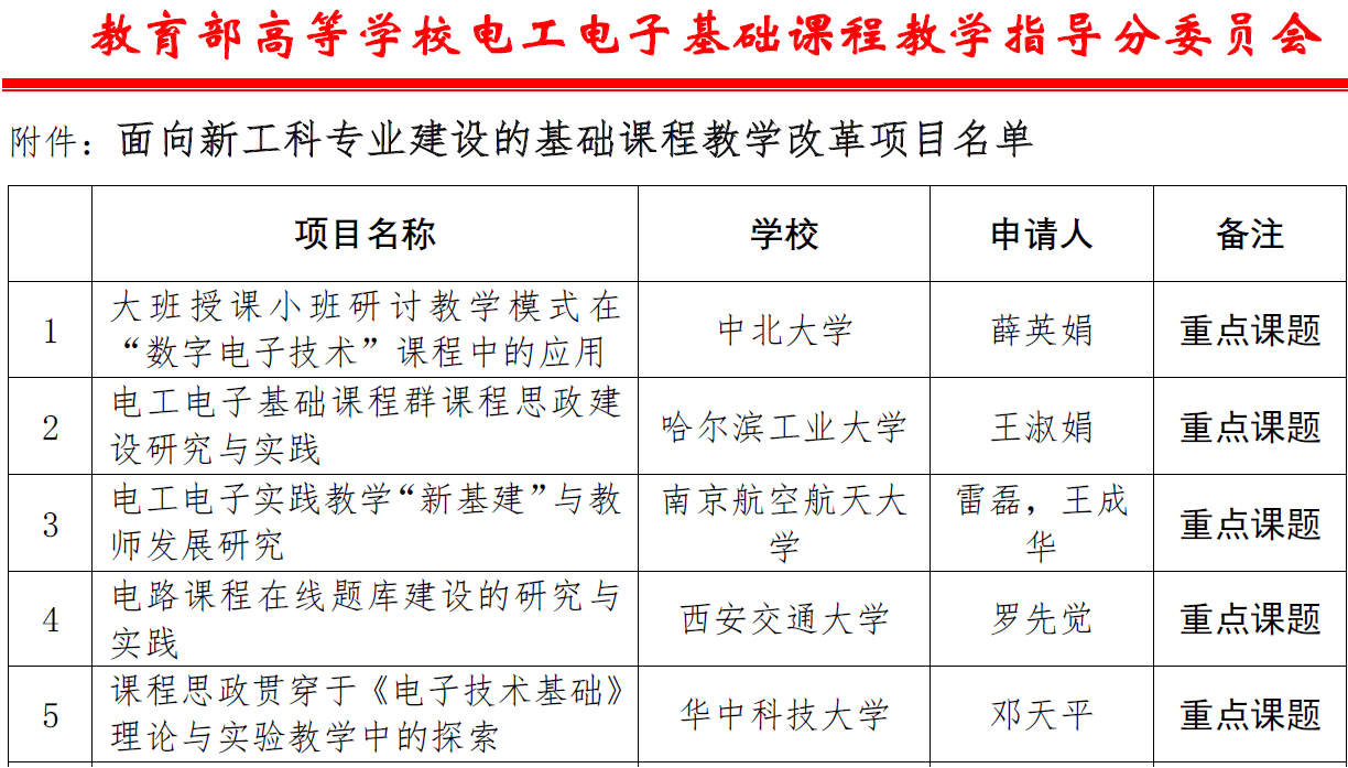2022年1月,教育部高等学校电工电子基础课程教学指导分委员会对面向新工科专业建设的基础课程教学改革申报项目进行了评审立项,共有42 个项目获得教改立项,其中14 个课题被评为重点项目,857足球直播