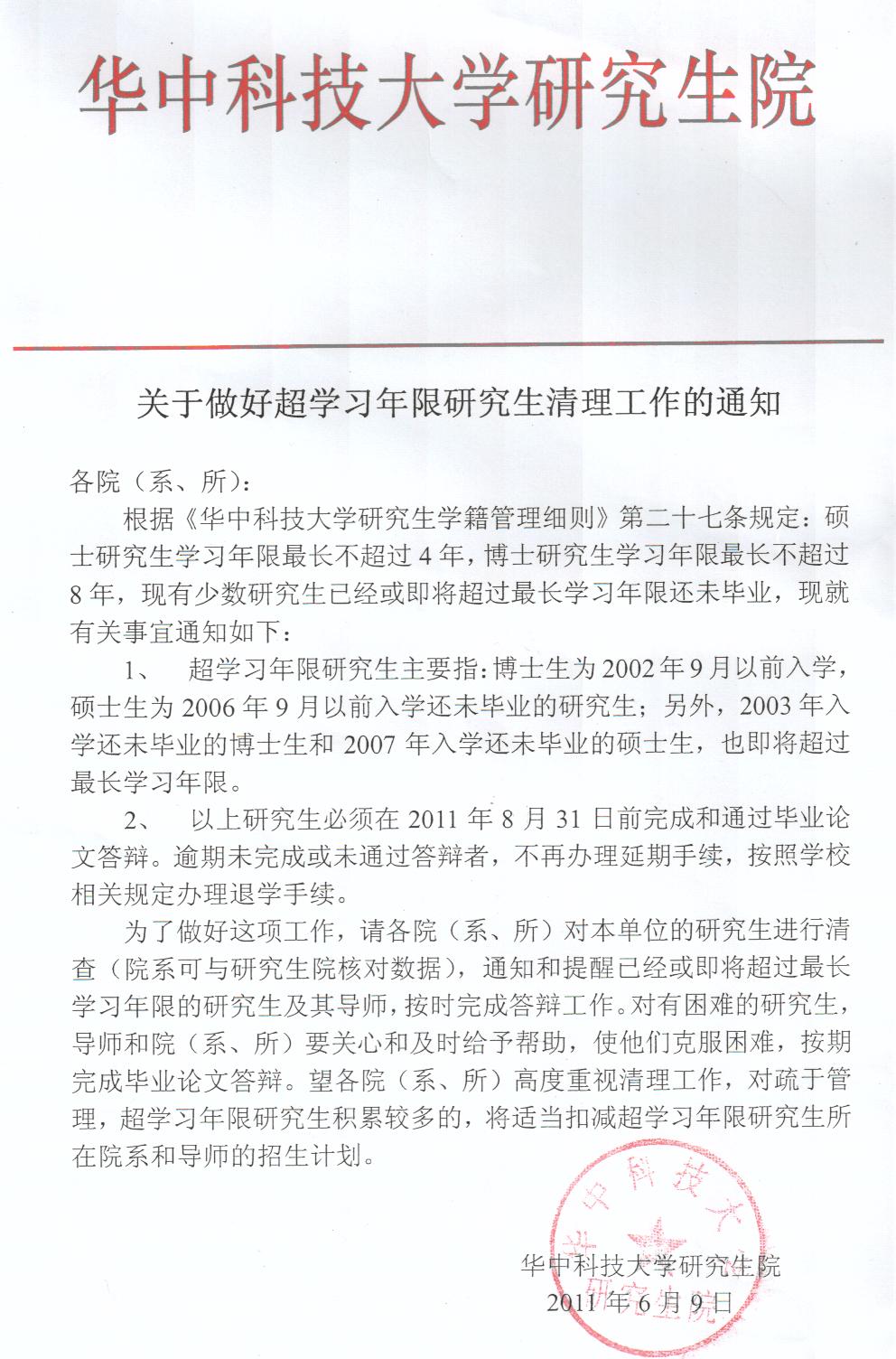 关于超学习年限研究生清理工作的通知(含博士生)