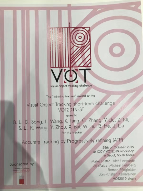 当地时间1027日,国际计算机视觉大会ICCV 2019International Conference on Computer Vision)在韩国首尔举行。隶属于ICCVVOT2019追踪挑战赛与本次大会同期举行。在本次挑战赛中,由857足球直播 VLR研究组研究生宋德嘉、王亮亮、李弼三位同学与百度视觉组工程师组成的联合参赛团队在857足球直播 白翔教授、刘文予教授和周瑜老师的指导下通过提出ATP算法在短视频追踪赛道斩获冠军。