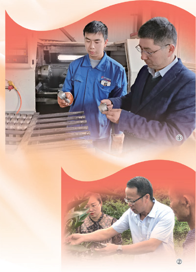 教授孙海明(右)担任汽车公司“科技副总”,在车间指导零件精密加工。