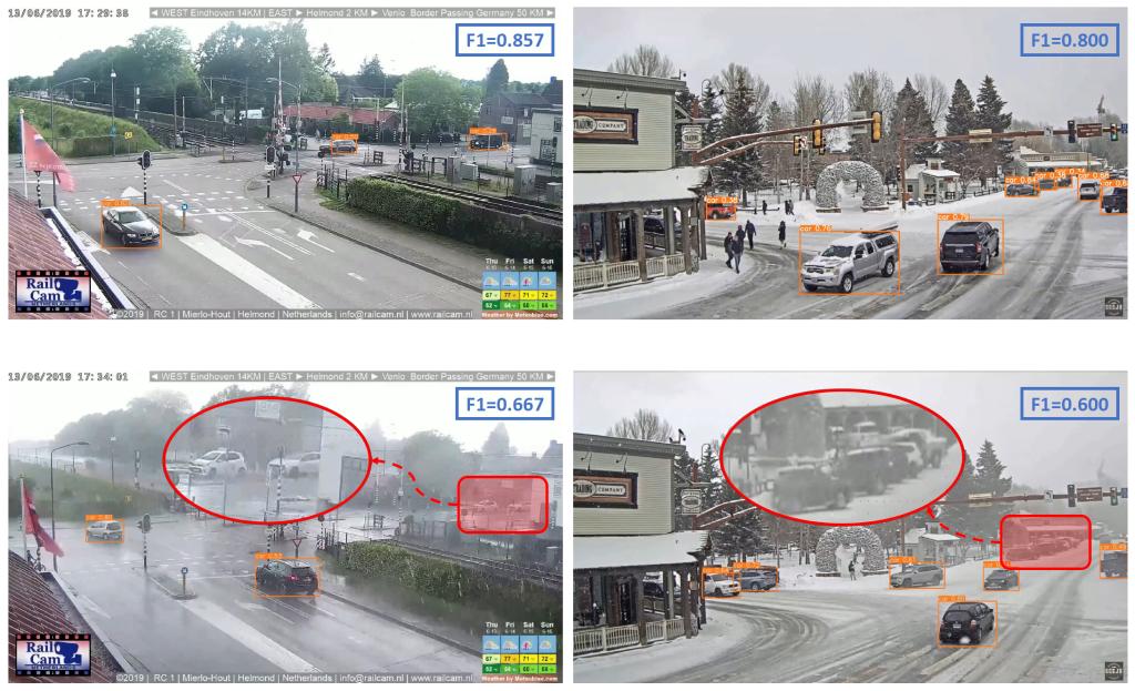 当前,在资源受限的终端设备上执行计算密集的视觉任务以实现高效的视频分析具有巨大挑战,尤其是当恶劣天气导致视频的成像条件恶化时。该项研究成果聚焦于恶劣天气条件下导致的低质量视频成像场景,为资源受限的终端设备(如摄像机)执行高精度的实时视频分析任务提供了关键技术方案。该团队设计了基于持续学习并利用边缘辅助的实时视频分析系统,通过持续更新部署在终端摄像机上的轻量级模型,实现对当前低质量成像视频的准确分析。大量数据集下的实验表明,该成果在交通监控领域的视频分析中具有显著应用潜力。在各种恶劣天气条件下,该成果都能够有效提升交通监控视频分析的准确性,确保在恶劣天气条件下仍能精确获取交通路况信息。