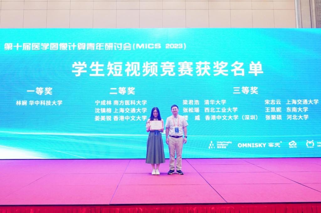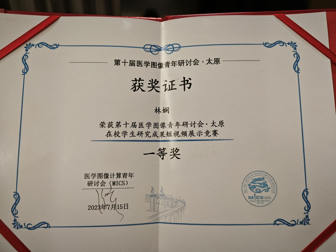 2023年7月第十届医学图像计算青年研讨会 (MICS 2023)在山西太原隆重举办。857足球直播 数字媒体与智能网络实验室((Digital Media and Intelligent Network, DMIN))的2022级博士生林娴在喻莉教授和闫增强副研究员的指导下,和来自清华大学、香港科技大学、香港中文大学、上海交通大学等20家高校的博士生硕士生同台竞技,最终在学生研究成果竞赛环节脱颖而出,荣获一等奖。