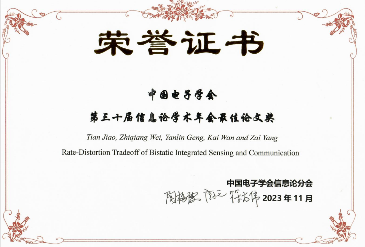 此外,万凯博士还获得了CIEIT 2023的最佳论文奖(大会唯一一篇,合作单位包括西安交通大学,西安电子科技大学)和最佳报告奖(合作单位包括广西师范大学和德国柏林工业大学)。这两篇文章分别针对双基站通信感知一体化系统和多节点边缘缓存系统,提出高效的传输方案,再通过信息论逆证明,刻画系统性能极限的上下界。