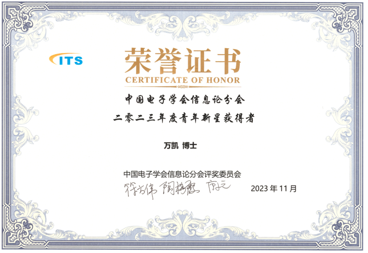 研究员万凯博士荣获中国电子学会信息论分会青年新星奖、CIEIT 2023最佳论文奖和最佳报告奖。