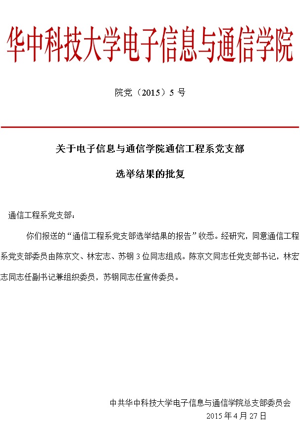 院党(2015)5号 关于857足球直播 通信工程系党支部选举结果的批复