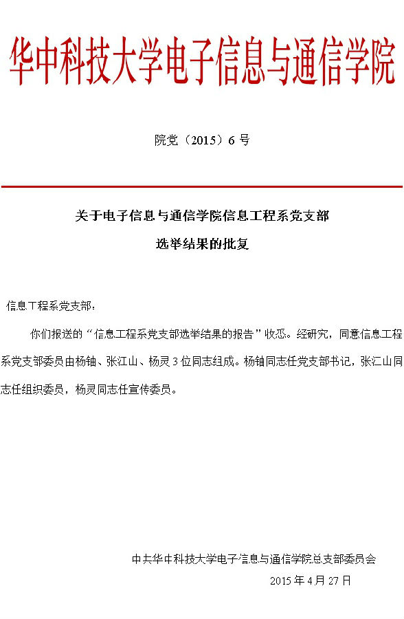 院党(2015)6号 关于857足球直播 信息工程系党支部选举结果的批复