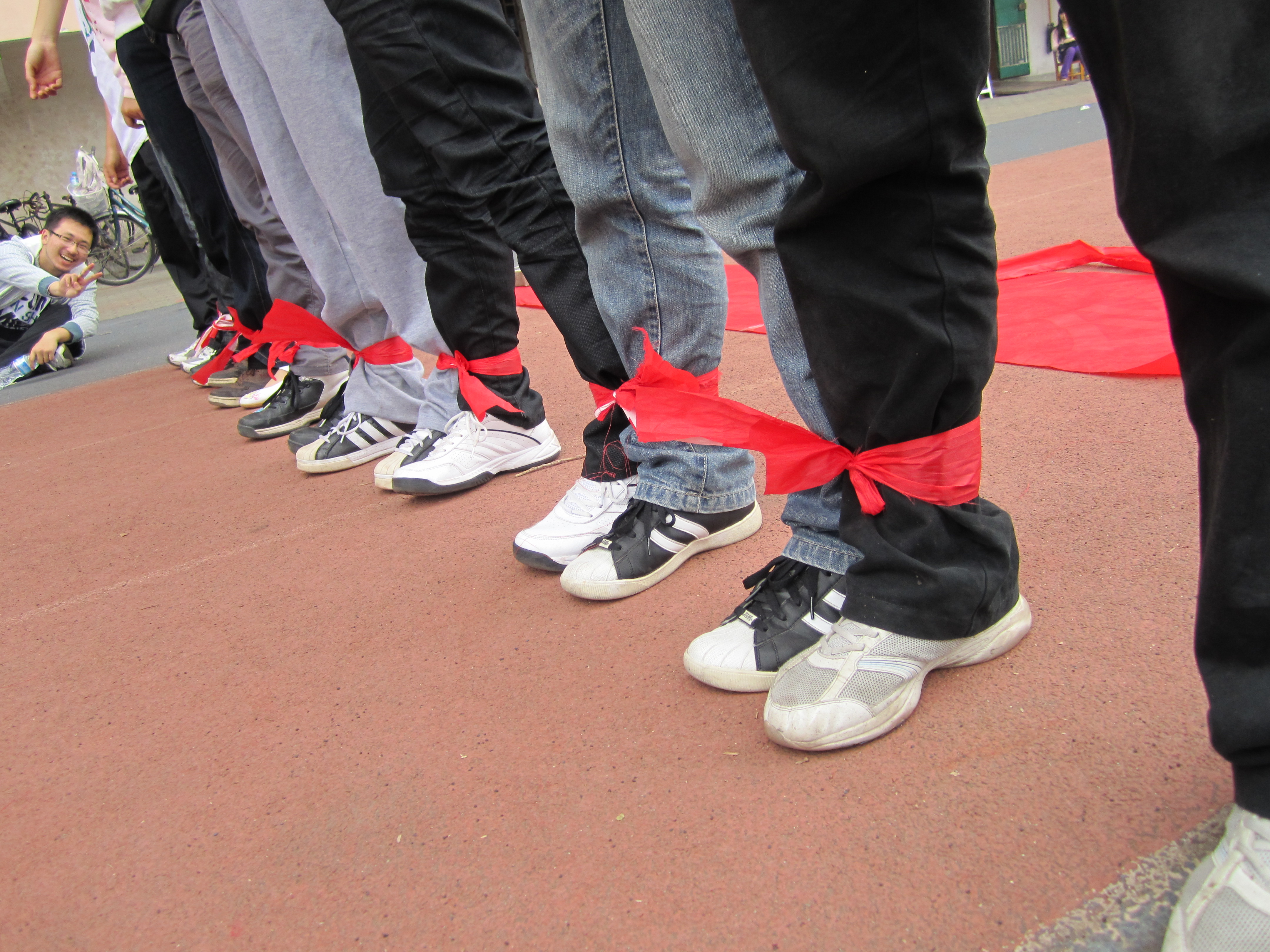最后一个项目是绑腿跑,平时健步如飞的同学现在可是步履蹒跚。口中喊着“一二,一二”,双腿却不大听自己使唤,只能随着队友的节奏迈腿。有时,为了调整即将散掉的队伍,大家都停下各自的脚步,小心翼翼地挪到同一起跑线上,再次出发,直到艰难地到达终点。路走的很辛苦,大家却是一脸笑容。