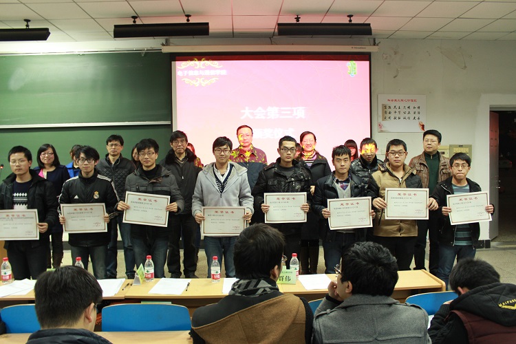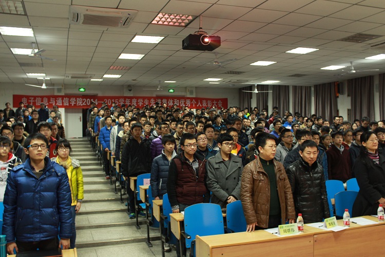 2014年学生工作在各方面取得的成果。嘹亮的国歌应声响起,全体师生起立致敬。在王殊院长宣读表彰决定后,2013-2014学年度华中科技大学“三好学生标兵”、“三好学生”、“优秀学生干部”、“优良学风班”的先进集体和优秀个人代表在热烈的掌声中依次上台领奖。而后获奖代表依次上台发言分享自己的学习、科研、生活等方面的经验。“国家奖学金”获奖代表卓越1101班丁文超同学展示了自己大学三年获得的科技、学习的有关奖项,着重分享了在科技创新活动中的经验感受。“三好学生标兵”获奖代表,提高1201班王洪阳同学总结了自己三年来的学习、生活经验,总结出“埋头做,抬头看”是成功的必备条件。从提高学习效率、开阔眼界与创业名人交流、科技创新等几个方面分享了自己的经验。“优秀寝室”获奖代表,电信1103班李晶玲同学讲述了自己寝室的一些成果,以及室友们一起奋斗的历程。“优良学风班”获奖代表谢存煌同学与大家分享了优良学风班的建设经验。用PPT展示了电信1104班四年取得的优秀成绩,并详细介绍了班级同学的去向。