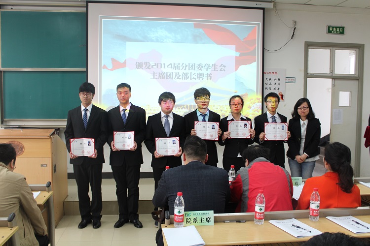党总支副书记周群伟、学工组长梅健、分团委书记项威、辅导员高骥、司玮辰、潘欣、张昊以及华中科技大学学生会主席陈家乐出席会议。大会由2014届团学联副主席李频靓主持,校学生会主席陈家乐代表校学生会致信祝贺。