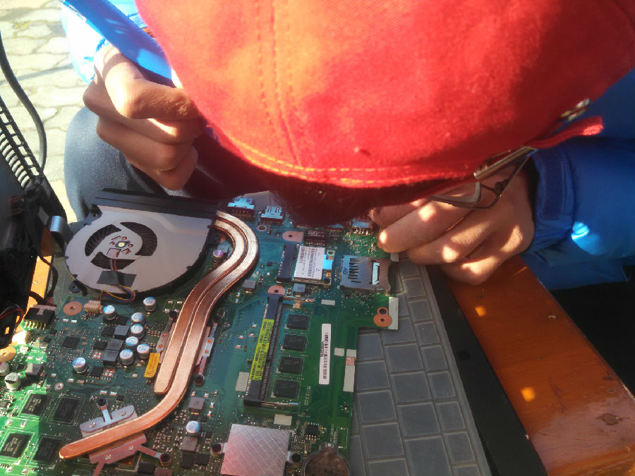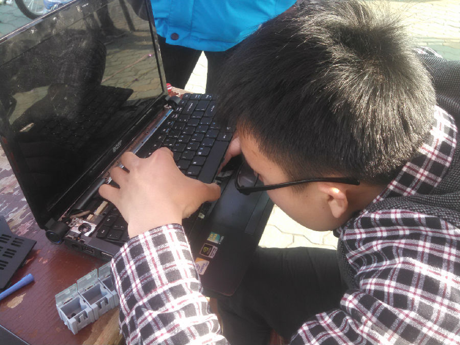 作为现在的小红帽副队,姜鑫一直以其精湛的技术和完备的能力为小红帽的活动提供了强有力的支柱,令众多队员折服,也让许多送电器前来的同学、老师、居民刮目相看。图中为小红帽队员姜鑫为笔记本电脑检查排线。