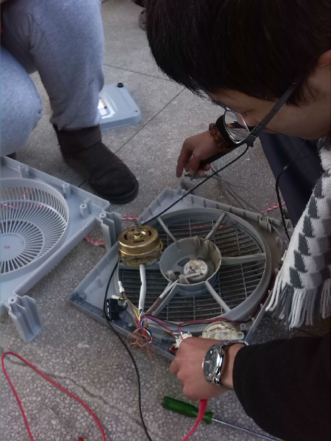 小红帽队员的合作也是工作中的亮点,小红帽的女队员也经常能够起到很大的作用,作为女生一样可以动手修理,不怕脏、不怕累。图中为小红帽队员李倩茹和郦颖烜一起维修电风扇