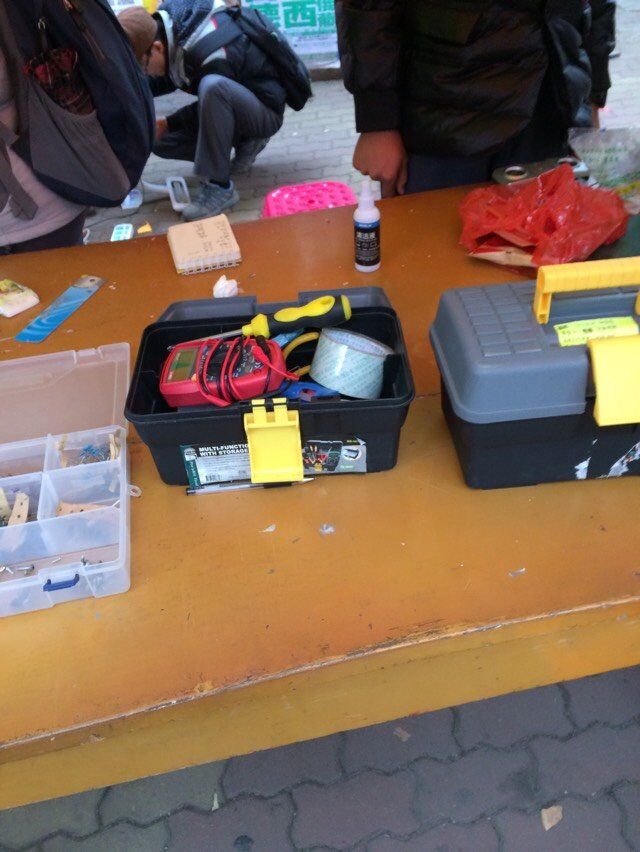 (×_×)好多的工具啊….5.3号,又是小红帽们充实的一天,图中远处为小红帽队员杨龙龙修理台灯,杨龙龙一直是队里勤恳认真的好助手。