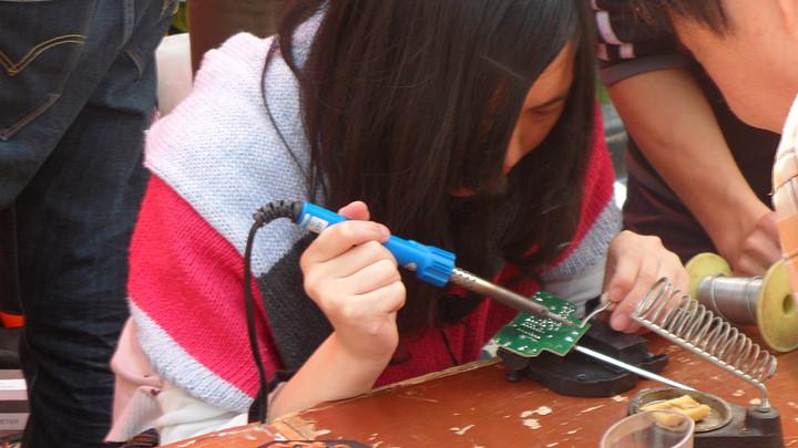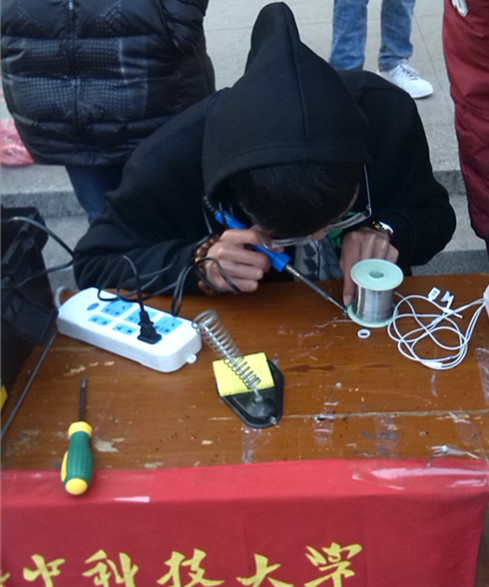 小红帽队员李楠作为后来新加入的队员,也一直表现优秀,积极参与志愿服务,活动热情很高。图中为小红帽队员李楠在修理、焊接笔记本的USB接口。
