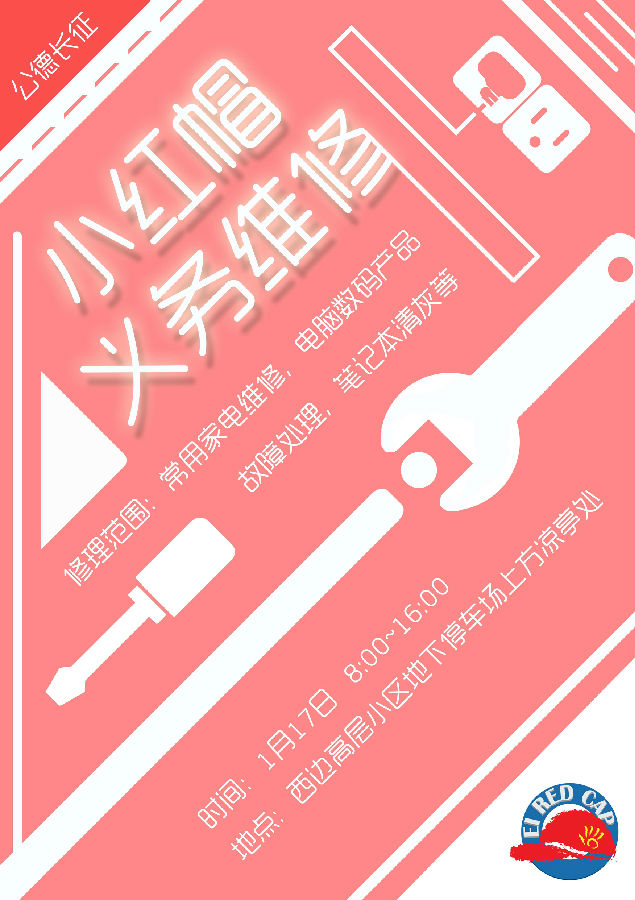 ps:(小红帽可以修什么?随着小红帽历届队员的经验积累与扩充,小红帽的维修服务种类已经从单纯的常用家电例如台灯、风扇等扩充到电脑、手机等电子产品。小红帽可以进行电脑清灰、重装系统、分区设置等。零杂的电器也可以修,比如耳机线、充电宝之类。有需要,就有小红帽!)