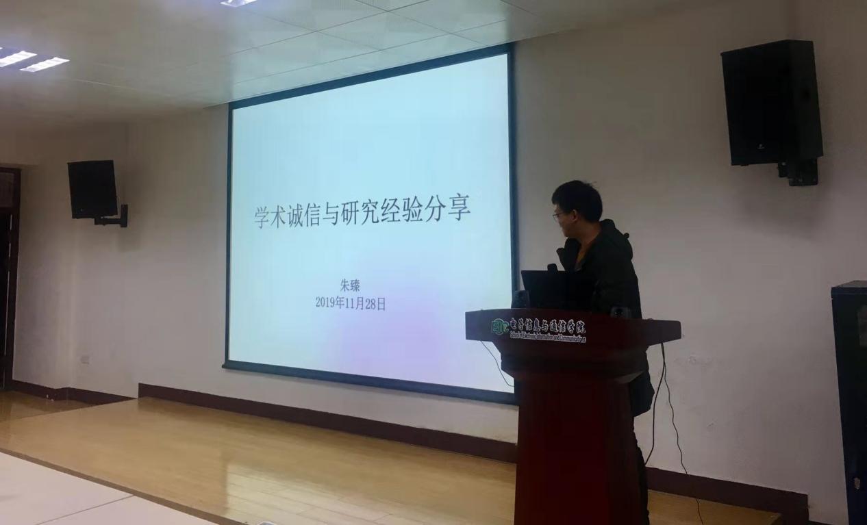 朱臻则是从学术诚信与研究经验两个方面来为大家讲述经验。首先他为大家介绍了大环境下的学术现状;接下来,以自身的经历告诉大家如何保持正确的前进方向和自身的学术诚信,引起了同学们的共鸣。最后他强调,真正的大方之家,都是以少胜多,并以此勉励在场的同学。