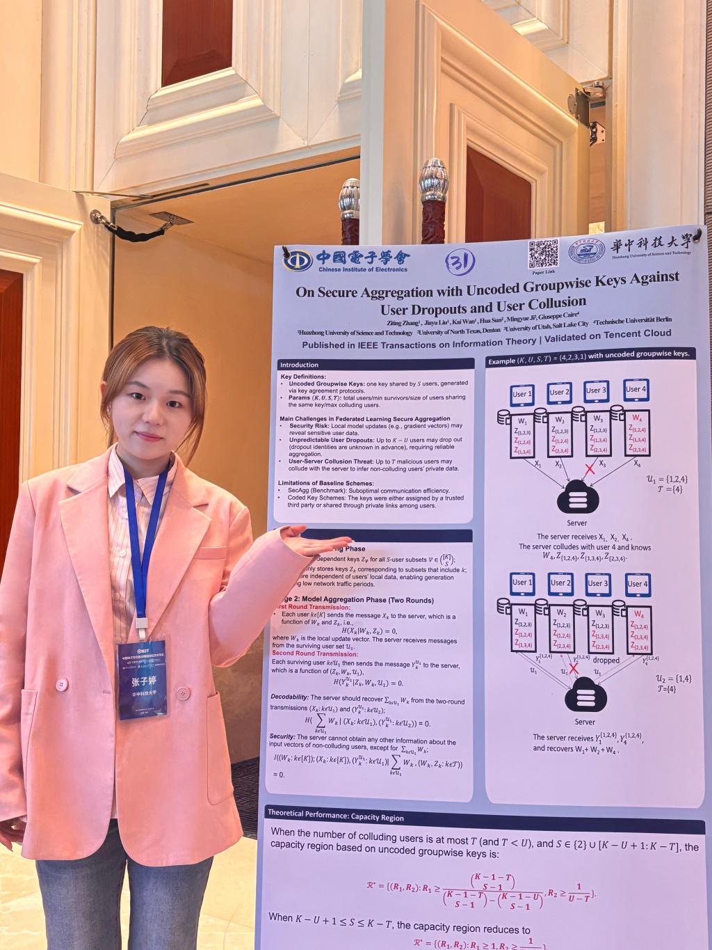 科研成果方面,她学术产出丰富且质量优异。作为第一作者,她在国际信息论领域旗舰期刊《IEEE Transactions on Information Theory》(CCF-A类)发表论文,还在同领域旗舰会议2024年IEEE International Symposium on Information Theory(ISIT)发表论文;同时以第二作者身份在2025年ISIT会议发表论文。这些成果聚焦联邦学习安全痛点,她提出基于未编码分组密钥的安全聚合方案,能抵抗用户串通与丢失问题,不仅严谨证明通信容量域,还让模型聚合时间减少43.68%-65.12%,在安全性与通信效率间实现平衡。此外,她参与两项高规格国家自然科学基金项目,分别是重点专项《智能反射面辅助的新型无线通信数学理论与数学技术》和优秀青年项目(海外)《分布式存储与计算的信息和编码理论》,在项目中积累了扎实的科研实践经验。荣誉上,她先后获得 2024 年校级优秀研究生(自强奋进)、2023 年一等硕士学业奖学金、2024 年二等硕士学业奖学金及华为奖学金,还担任国际期刊《IEEE Transactions on Communications》审稿人,在 2023 年 ICCCS 国际会议上做英文口头报告,学术能力获多方认可。