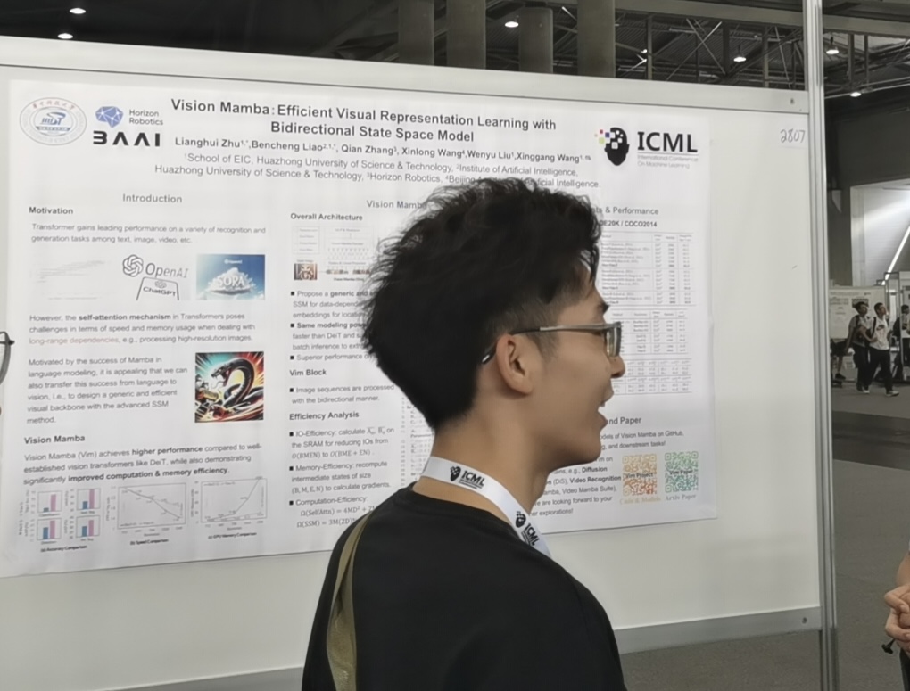 朱良辉不仅在视觉识别领域深耕细作,还勇于跳出科研舒适圈,探索全新方向。2023年初,王兴刚老师推荐他来到北京智源人工智能实验室实习,开启了新的基础模型研究。通过深入阅读、反复思考和大量实验,他成功提出首个超越GPT-4的大语言模型裁判方法,并创建了一个简单易用的开源代码库。该代码库因其简洁实用性和优越的性能,目前已收获400+的Github收藏。之后,在王兴刚老师的指导下,朱良辉和师兄一起投入线性基础模型架构的研究,他们提出的VisionMamba方法首次将图像视作一维序列,并使用硬件高效的基础架构取得了世界最优的结果。该方法受到了科研界的广泛关注,被称为有希望替代Transformer的下一代通用人工智能骨干网络。