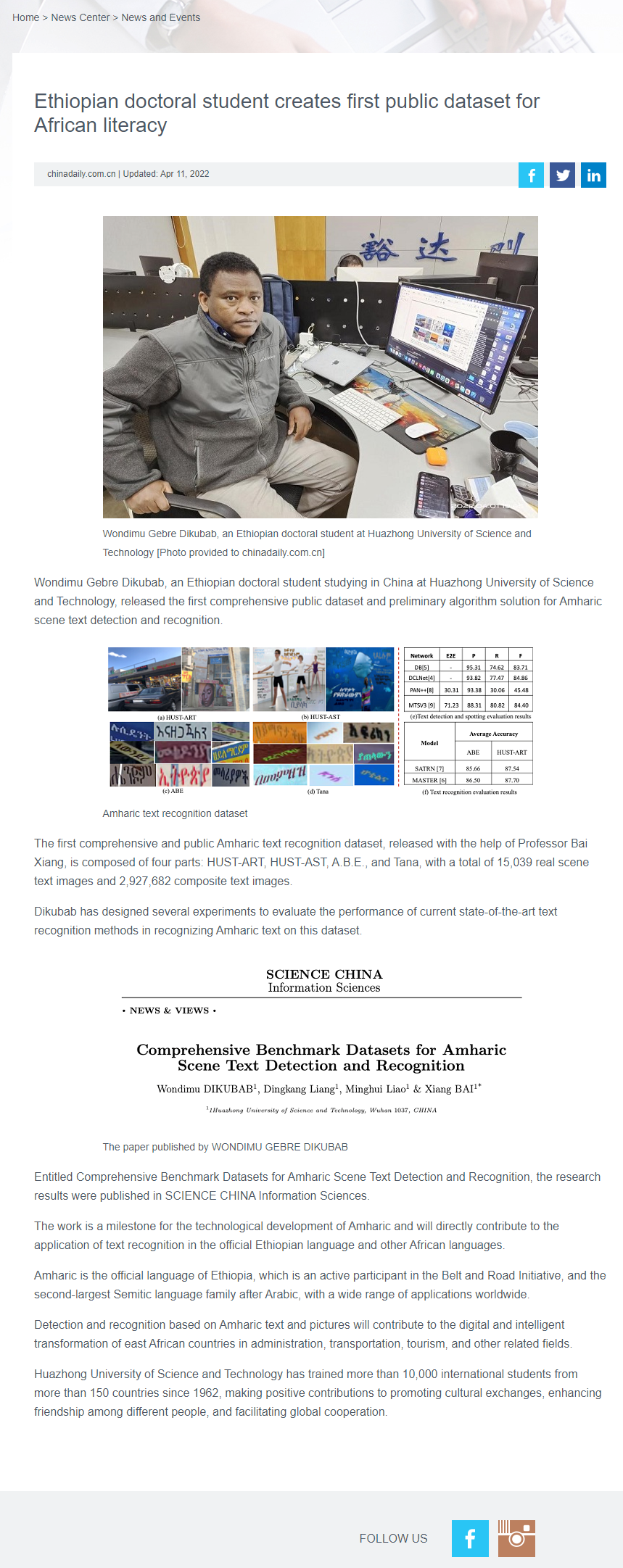 China Daily 报道857足球直播 国际学生发布首个面向非洲文字理解的公开数据集://studychina.chinadaily.com.cn/s/202204/11/WS62552561498e6a12c1229b6b/ethiopian-doctoral-student-creates-first-public-dataset-for-african-literacy.html?fbclid=IwAR2Hr1OmWGdv_Do1idPlf7fvfKxObobVYv570x5Z4VEzdrCVhhMfgj-VssQ