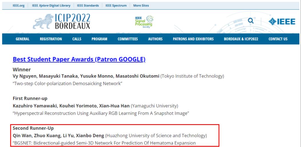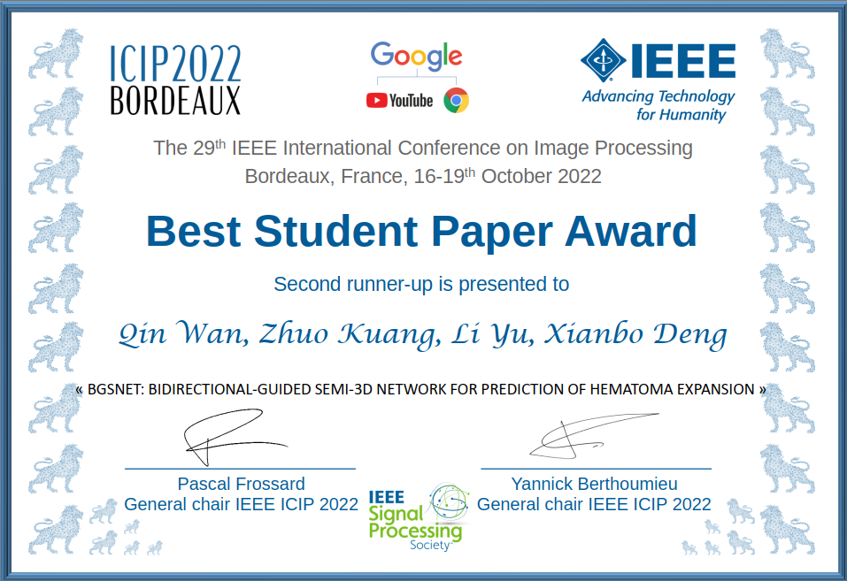 2021级硕士研究生万勤及其导师喻莉教授收到IEEE International Conference on Image Processing(IEEE ICIP)2022国际会议主席Pascal Frossard教授和Yannick Berthoumieu教授发来的祝贺邮件和获奖证书。邮件中对万勤同学和喻莉教授团队获得IEEE ICIP 2022的Best Student Paper荣誉表示祝贺,并指出评奖委员会对团队的最新研究成果“BGSNET: Bidirectional-guided Semi-3D Network For Prediction Of Hematoma Expansion”给予了高度肯定。论文作者包括857足球直播