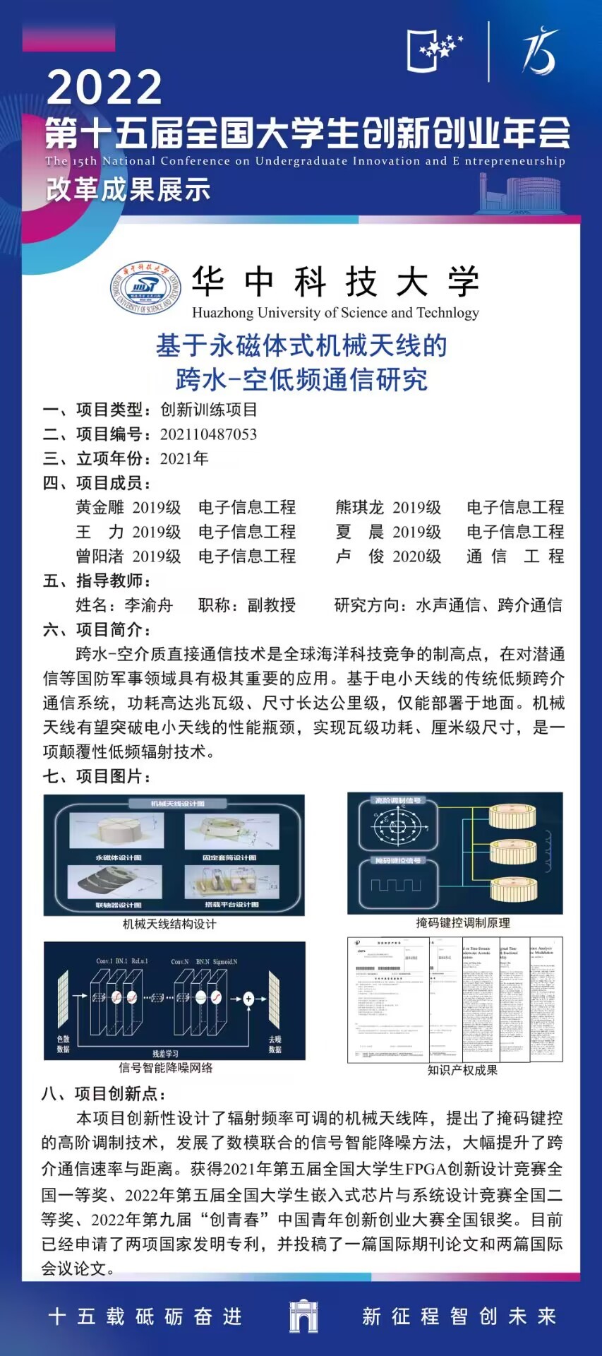 ,曾获全国大学生电子设计竞赛国家一等奖。于2019年参加了全国大学生创新创业训练计划,在指导老师尹海帆教授的悉心指导下,带领团队完成了智能超表面的理论验证和原型系统设计工作,完成院系级大创项目的结题验收。团队并没有止步于已有的成果,进一步提出了符合实际场景应用需求的波束扫描算法,被推选为省级大创项目。团队积极推动项目应用落地,已与国家电网签订合同,2020年被评为国家级大创项目,入选2021年全国大学生创新创业年会,获“我最喜爱的项目”奖。项目目前已受理5项专利,取得一项软件著作权,发表一篇IEEE TCOM期刊论文和一篇会议论文,被新华网,人民日报等媒体公开报道。随后,团队负责人也以该国创项目为基石,在学校“推动大创计划与专业教育融合、与学科竞赛结合”的政策支持下,参加了第七届中国国际“互联网+”大学生创新创业大赛,夺得大赛高教主赛道全国金奖,该项目也是湖北省唯一入选大赛科技成果展的项目。国创计划不仅提升了学生的专业能力,也开拓了学生的眼界和格局,团队三位同学均保送本校研究生,在指导老师的实验室继续智能超表面的研究工作。