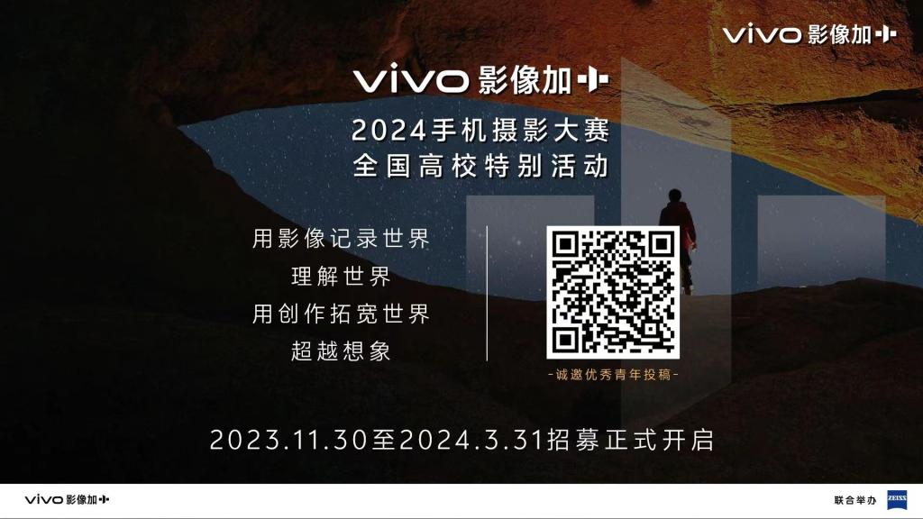 自2020年举办首届vivo影像+手机摄影大赛至今,赛事规模和影响力逐年提升。每一幅作品都承载着创作者的情感、故事与思考,勾勒出包含当下时代特质的人文画卷。让我们一起让“光影交汇,定格青春”,拿起手机,再+一张。vivo影像加+摄影大赛秉持着“人人都是创作者”的理念,致力于发展并完善人性化的专业移动影像系统,用影像记录生活创作生活。2024vivo影像加+全国高校特别活动是面向境内在校大学生的摄影活动,旨在发掘和展示青年摄影才华,鼓励他们用镜头记录生活,表达情感。同时,邀请来自世界各地的vivo用户用影像讲述他们心中最真切的人文情感。