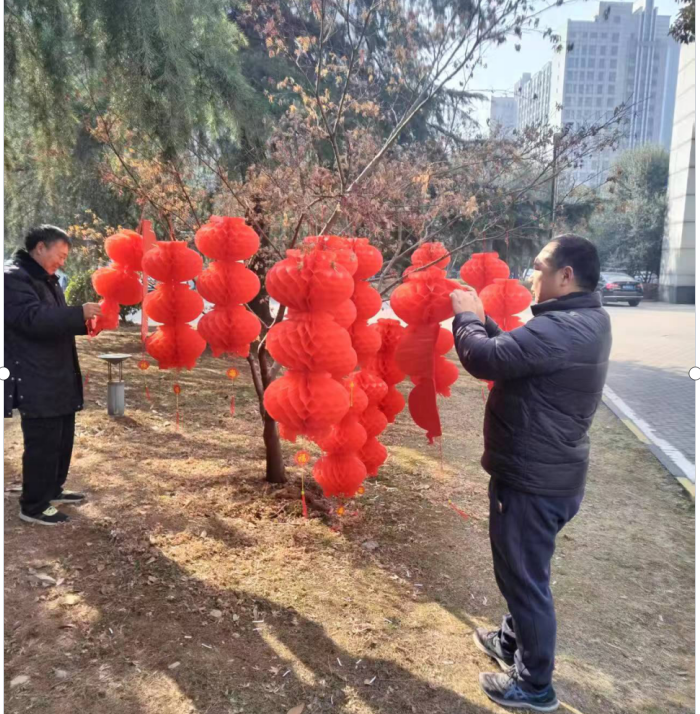 在氛围营造方面,为迎接新春佳节,在园区主干道、实验室、办公区悬挂灯笼、中国结,布置节日主题的暖心装饰,营造喜庆祥和的节日氛围。春节期间,值班人员每日巡查水电设施、楼宇门窗,并加强夜间安保巡逻,用“不打烊”的服务贴心守护校园安宁。