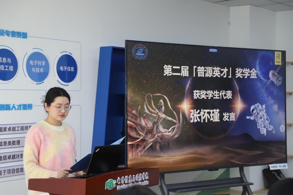 葛茜和马鑫共同为第二届“普源英才”奖学金获奖同学颁奖。获奖代表张怀瑾表示,普源精电仪器出色的性能和可靠性为她的科研实验和项目带来巨大帮助,她对此深表感谢,并建议同学们要以饱满的热情投入学习与科研中,深耕专业技能,提升工程实践能力,努力成为具备创新精神、实践能力和国际视野的高素质新工科人才。