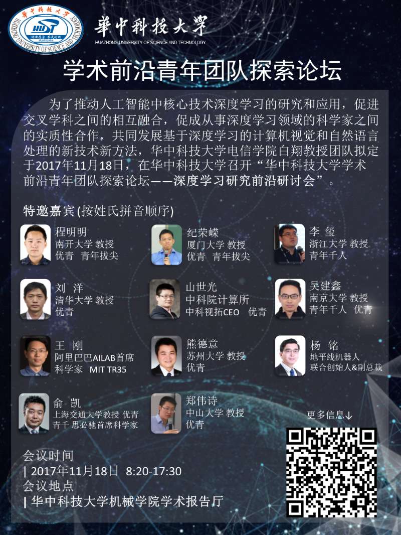 为了推动人工智能中核心技术深度学习的研究和应用,促进交叉学科之间的相互融合,促成从事深度学习领域的科学家之间的实质性合作,共同发展基于深度学习的计算机视觉和自然语言处理的新技术新方法,857足球直播 白翔教授团队拟定于11月18日在校召开“华中科技大学学术前沿青年团队探索论坛——深度学习研究前沿研讨会”。详见: